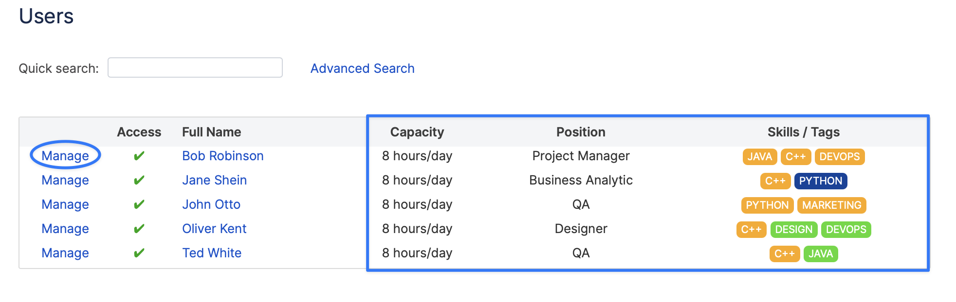 Additionally, he will have access to the Users tab in the Configuration section, where he can view, modify, and add Capacity, Position, and Skills/Tags for users within his team.