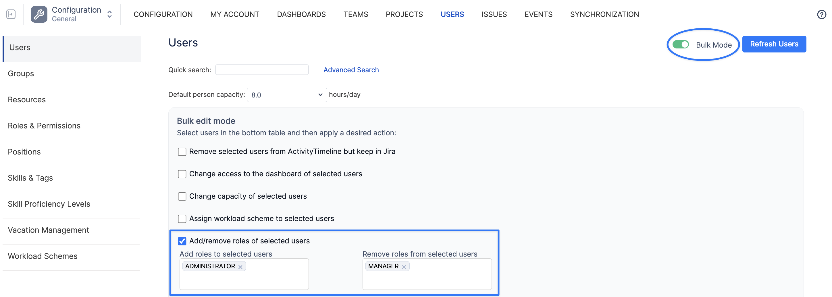 We recommend using the Bulk mode in Configuration → Users to assign roles to users in bulk, which helps avoid manual work. This feature can also be used to assign positions, capacity and etc.
