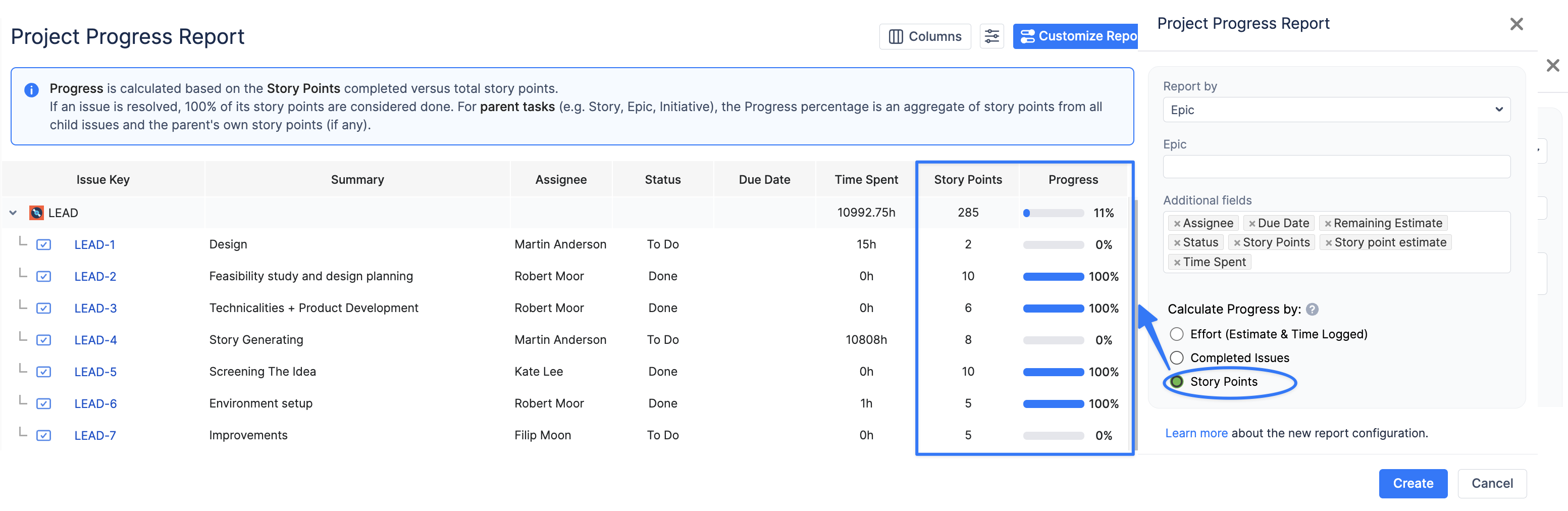 Story Points Support in Project Progress Report: The Project Progress Report now supports Story-points–based calculations. Progress for Projects, Epics, and JQL-based scopes is calculated by completed Story Points, offering more accurate metrics for teams that estimate in Story Points.