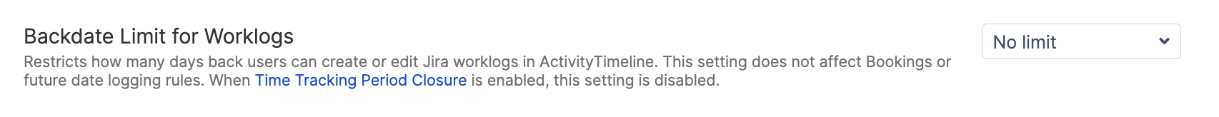 Past Worklog Limit (Backdate Restriction): We introduced a new Past Worklog Limit setting that restricts Jira worklogging to N days in the past. Admins can now enforce backdate logging policies directly within ActivityTimeline.