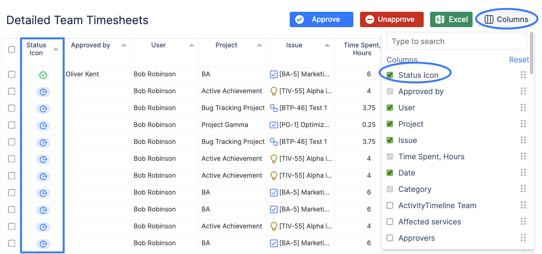 Status Icons for Worklog Approvals (Compact Mode): Detailed Timesheets now support a Status Icon column for approval statuses. This helps save horizontal space and improves readability, especially in compact layouts.
